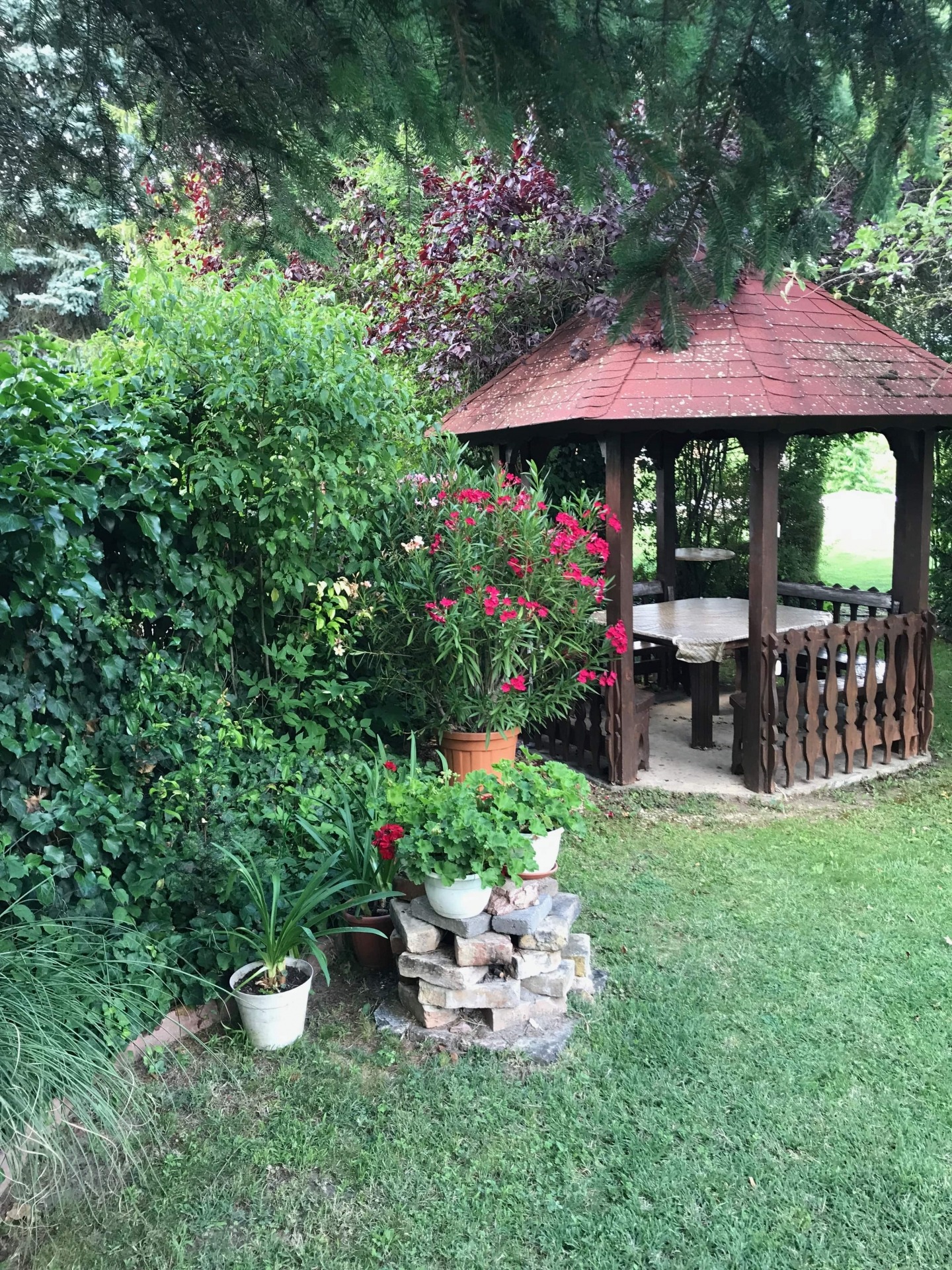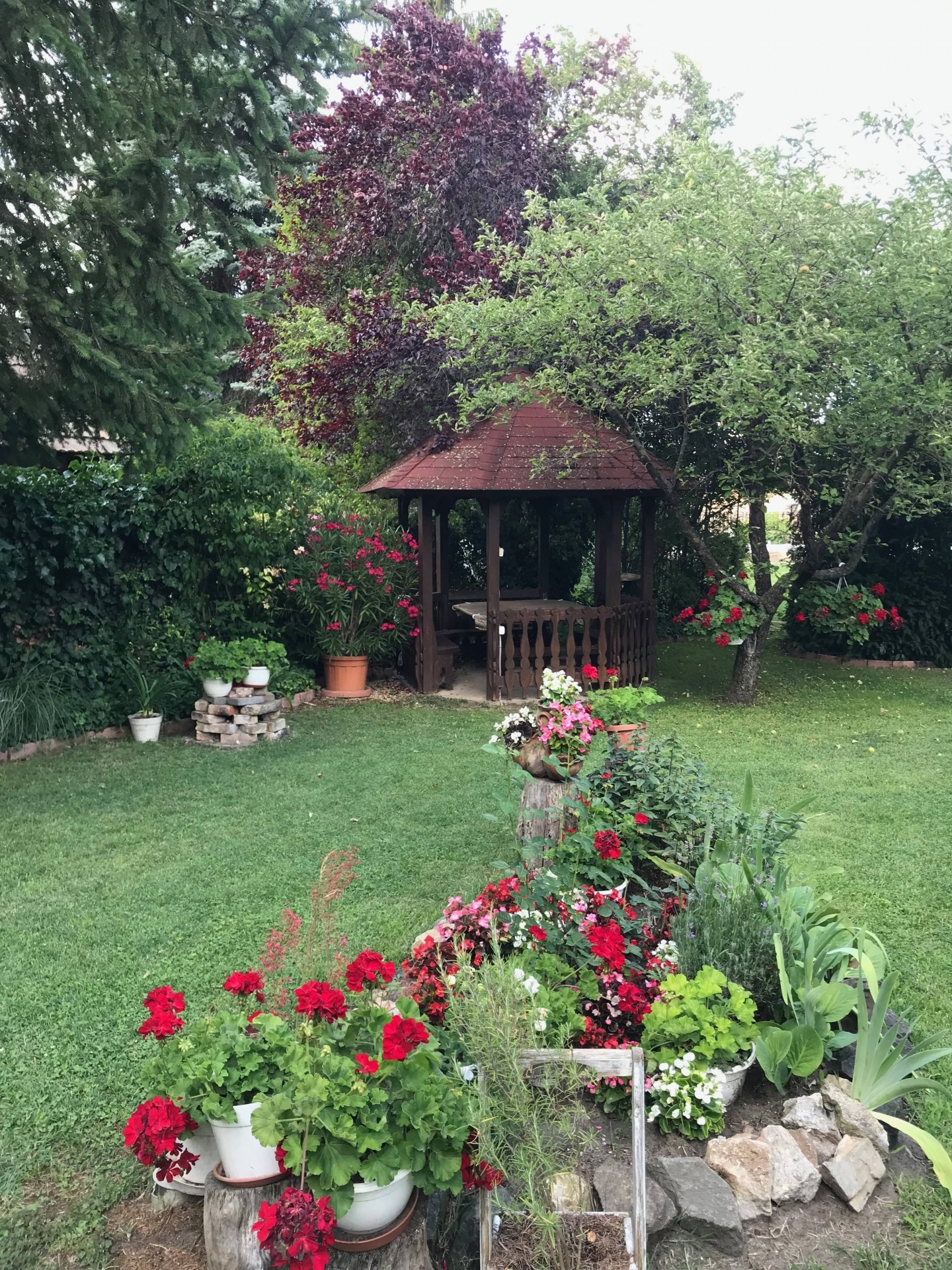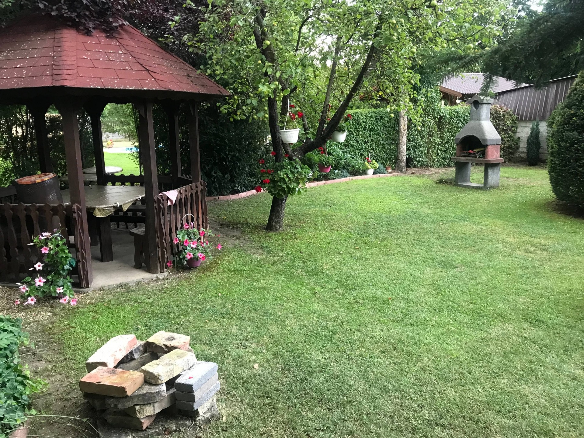 A rendezett, füves, fás, virágos, és öntözőrendszerrel ellátott kert, nyugtató pihenést ad egy fáradt hétköznap után a kényelmes szaletli alatt,ahol külön grillező, és bográcsozó került kialakításra.