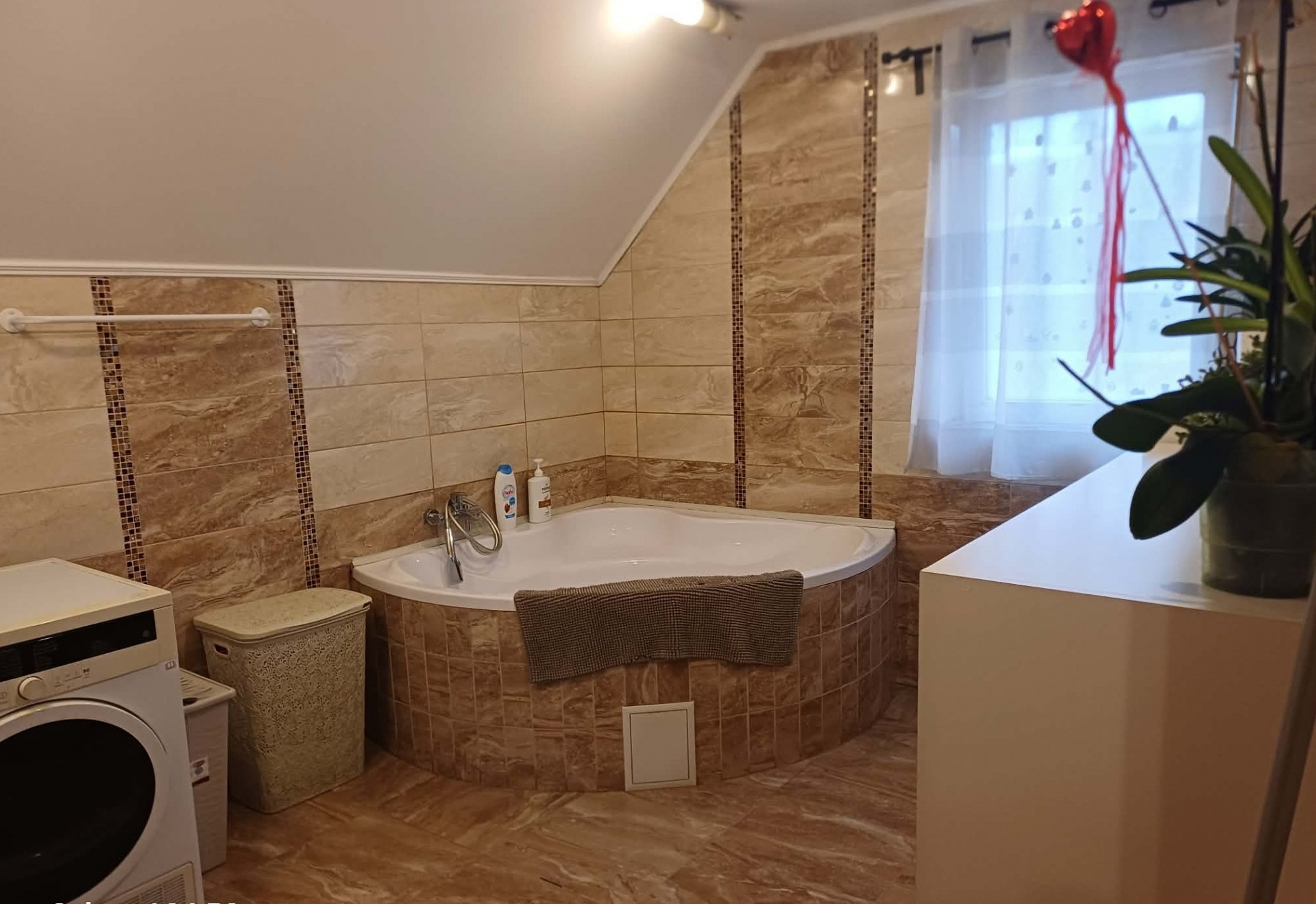 A 720 m2 nagyságú telken álló, 38 as porotherm téglából épült, tehermentes családiház 139 m2-e megadta a lehetőséget, hogy összetartó családként a fő lakrészben két generáció is együtt, de mégis külön élhesse mindennapjait.